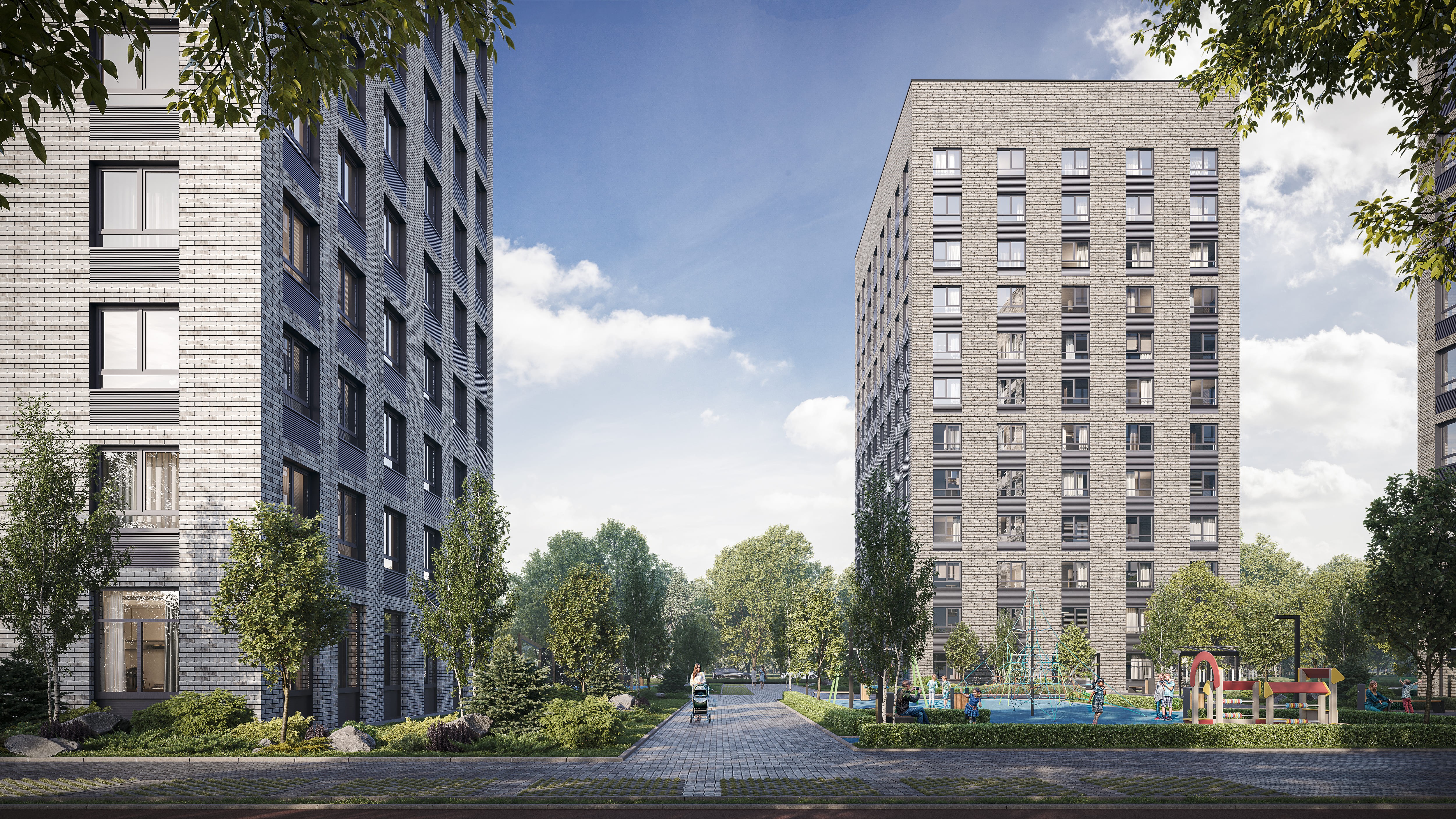 Корпуса спроектированы так, что от двух до пяти домов образуют уютные дворовые пространства с благоустроенными детскими площадками и зонами отдыха. Центральным элементом комплекса является прогулочная аллея, которая проходит вдоль всей застройки и включает пешеходные зоны, велодорожки, спортивные площадки и зеленые зоны для отдыха.